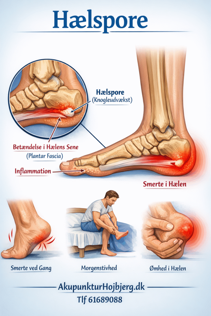 Hælspore er en smertefuld tilstand, hvor en knogleudvækst og betændelse i fodens seneplade (plantarfascien) kan give skarpe smerter under hælen – særligt ved de første skridt om morgenen. Traditionel behandling involverer ofte indlægssåler eller smertestillende medicin, men mange oplever stor lindring ved akupunktur.